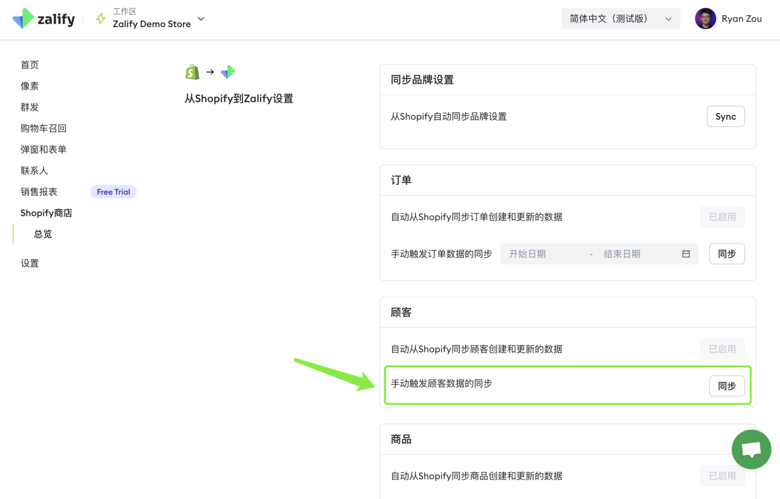 在左侧导航中点击「Shopify商店」,在「顾客」设置中点击「同步」,同步会在后台进行,同时你可以在左侧导航中来到「联系人」页面,刷新查看在增加的联系人数量。