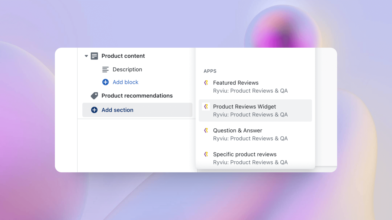 - 点击 + 添加分区,然后从列表中选择 Ryviu 的 Product Reviews Widget