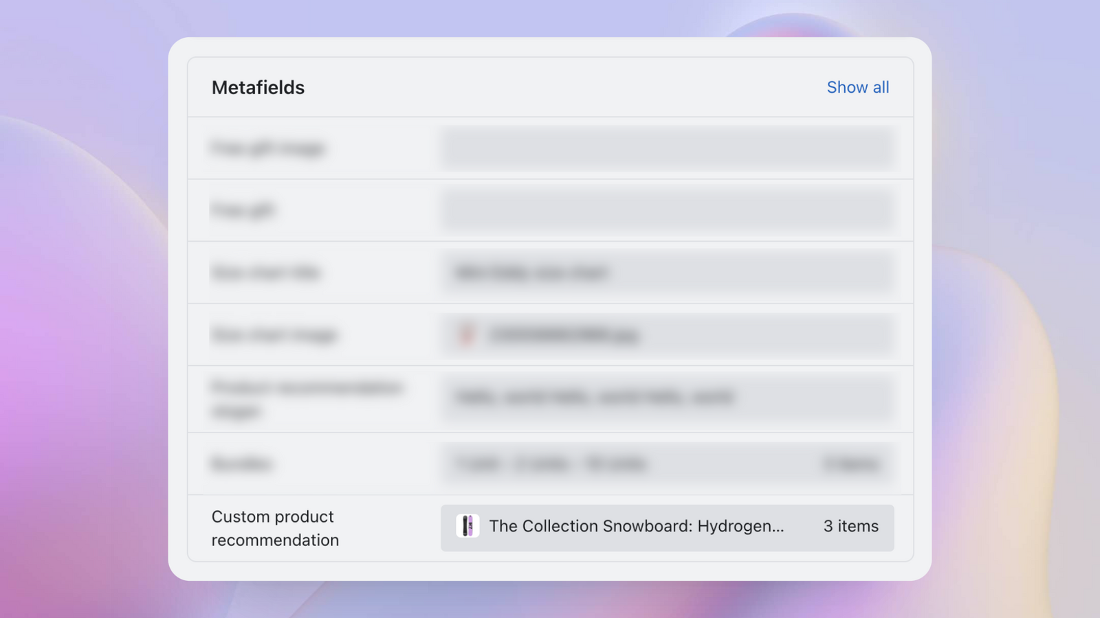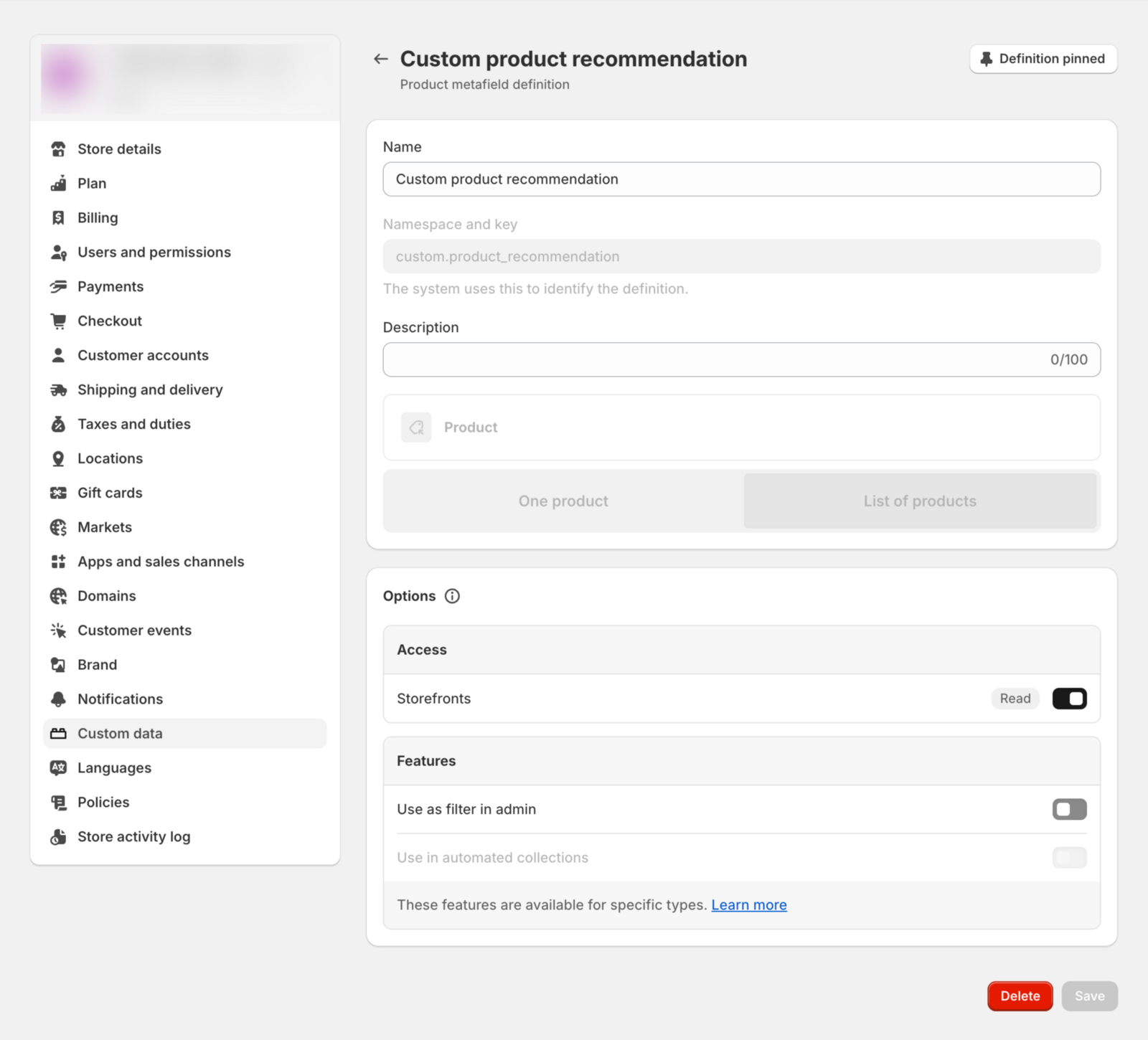 - 在 Shopify 后台中,转至 设置 > 自定义数据