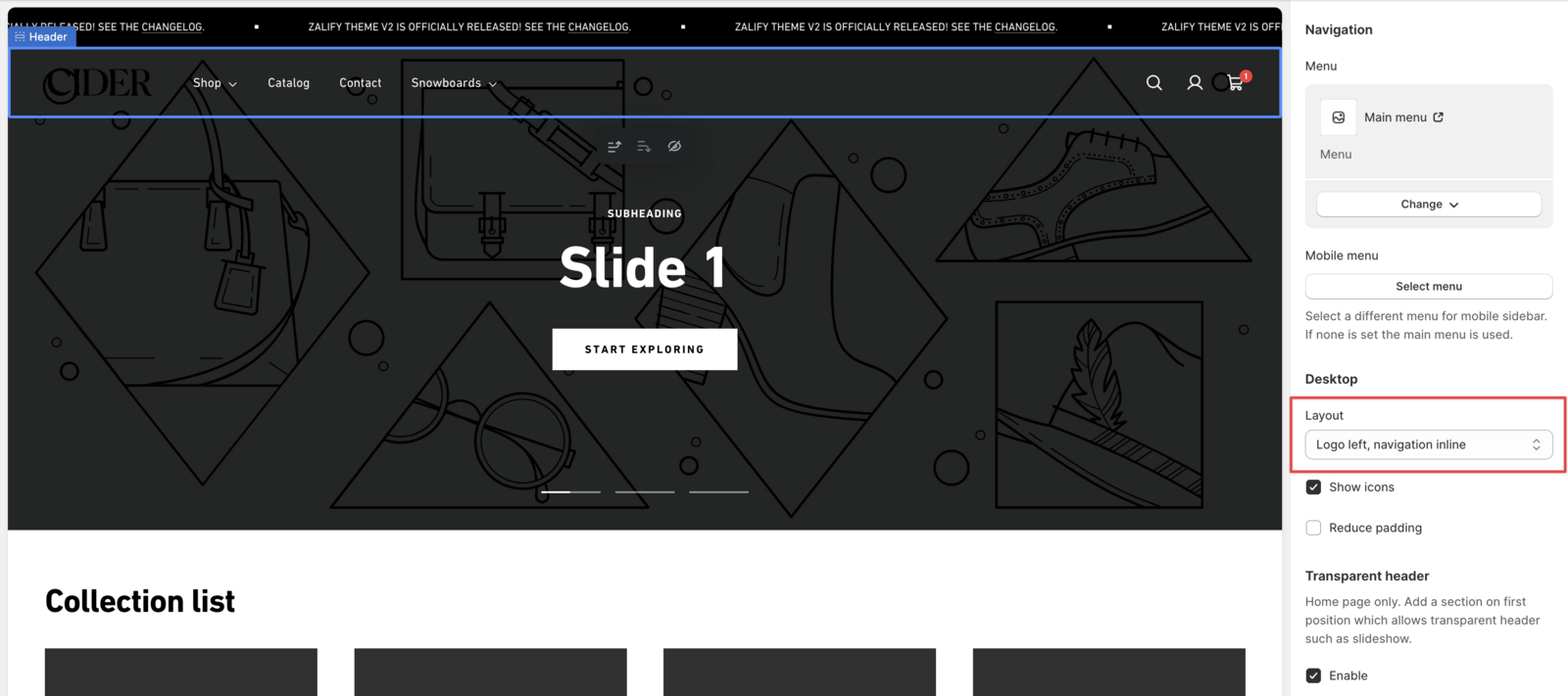 - 在 Header 的配置项中,勾选 Transparent header - Enable
