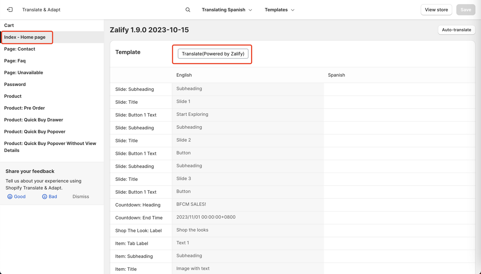 - Return to the main page of the “Shopify Translate & Adapt” app.