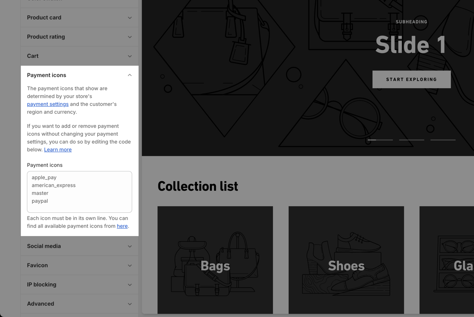 - 在 Payment icons 区域中,复制支付服务提供商列表的 可用值 ,也就是图标的文件名,以每行一个的格式填入